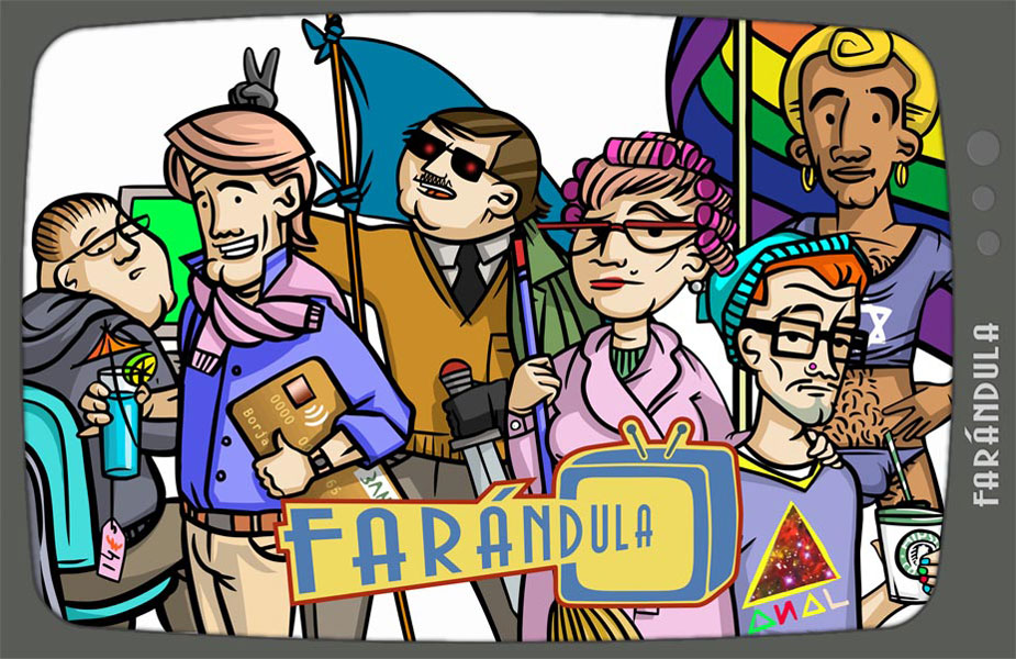 Farándula is a deck-building card game, published by BcP Games in 2014. The requested aesthetic was a cheeky cartoon, fully messing characters scrambled with high levels of political incorrectness. I developed 60 of the 120 illustrations that made up the total cards of the game. The developing point was to keep the focus in a thick line, concise in details, with fills of scandalous colors in two planes of light and shadow. Designed to ease a quick reading of the features and «abilities» of each character.
